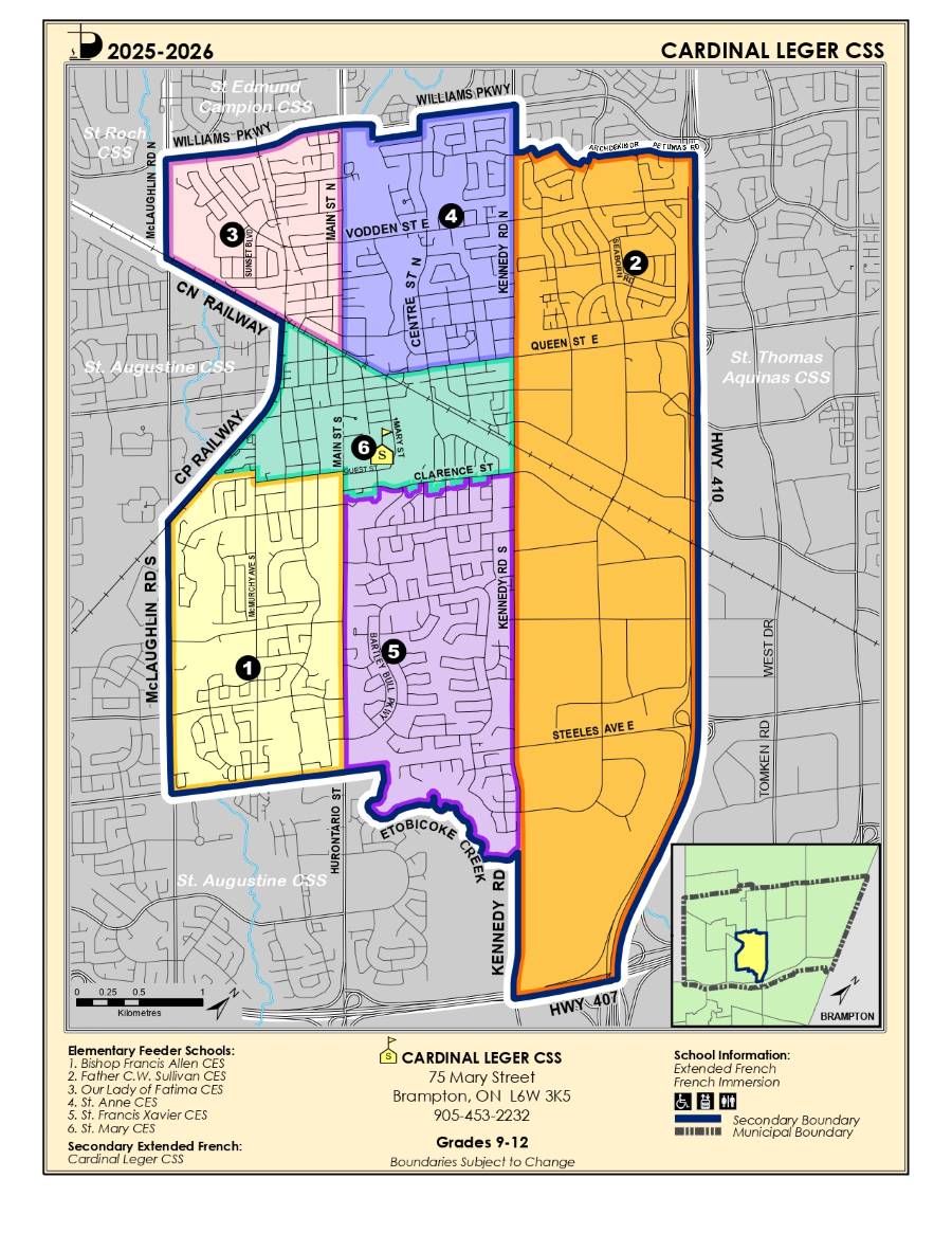 Cardinal Leger CSS covers a large catchment area extending from Williams Parkway in the north, to approximately Steeles Ave. W. in the south, with McLaughlin Rd. S. on its western edge, and Highway 410 marking its eastern boundary.