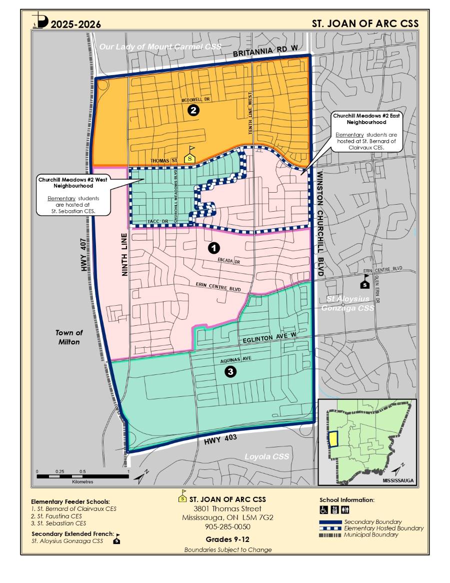 St Joan of Arc Mississauga has a large catchment area with approximately Britannia Road W on its northern boundary, the 403 highway to the south, Ninth Line in the west, and Winston Churchill Blvd. on its eastern edge.